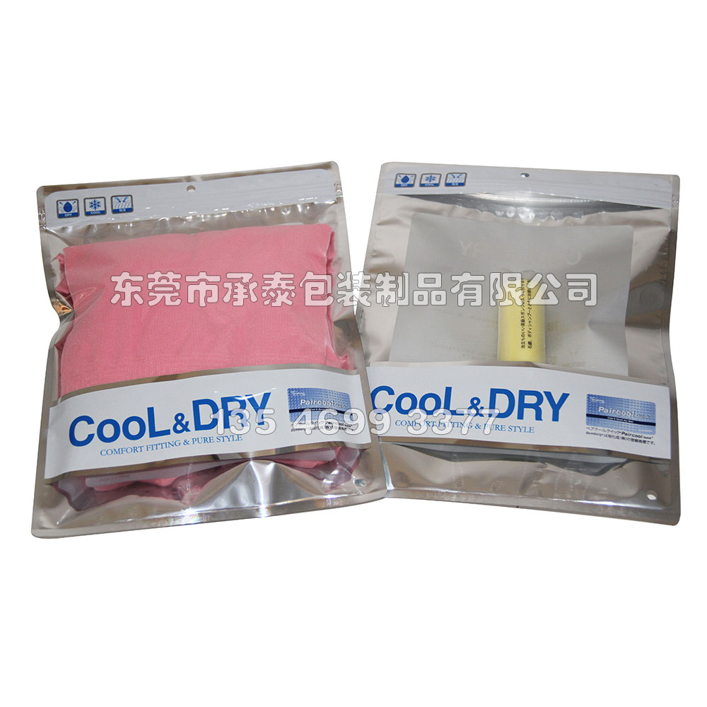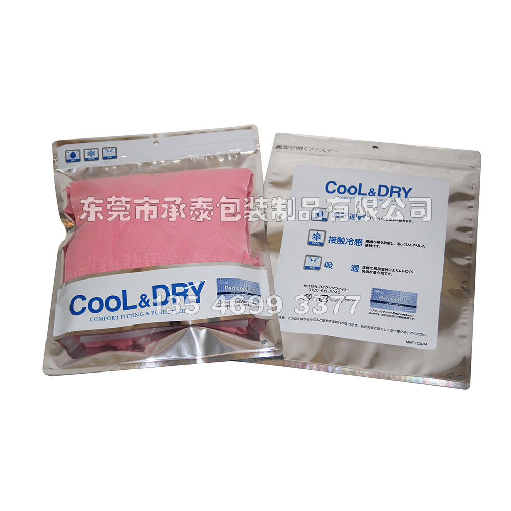 洗鋁三邊封內衣褲服裝拉鏈包裝袋,采用鍍鋁洗鋁工藝,洗鋁之后兼得鍍鋁銀色質感及開窗效果,最常見于服裝袋,內衣褲包裝袋等。