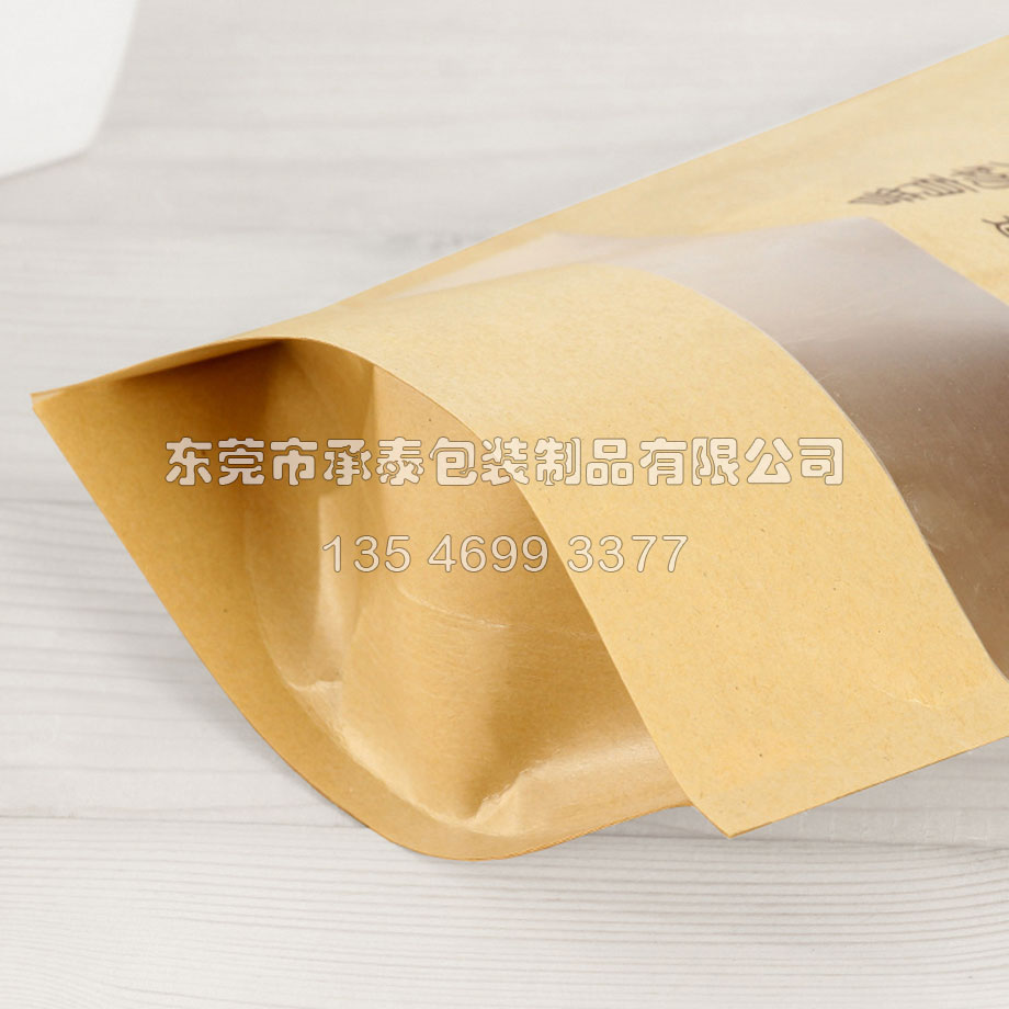 紙塑復(fù)合牛皮紙茶葉袋,牛皮紙表面復(fù)合啞光膜,內(nèi)部PE,密封防潮,袋身開透明窗。適用于茶葉、干果、零食等包裝。