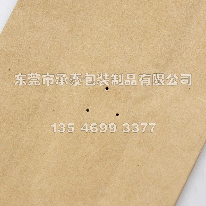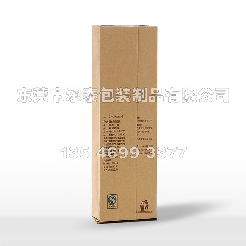 牛皮紙、鋁箔、塑料三種材質4層復合,具有完美的防潮、遮光、密封效果,袋身有安裝單向氣閥,在包裝烘焙咖啡等產品時,可以讓用戶聞到里面的氣味,但是外面的空氣又不會進入內部。
