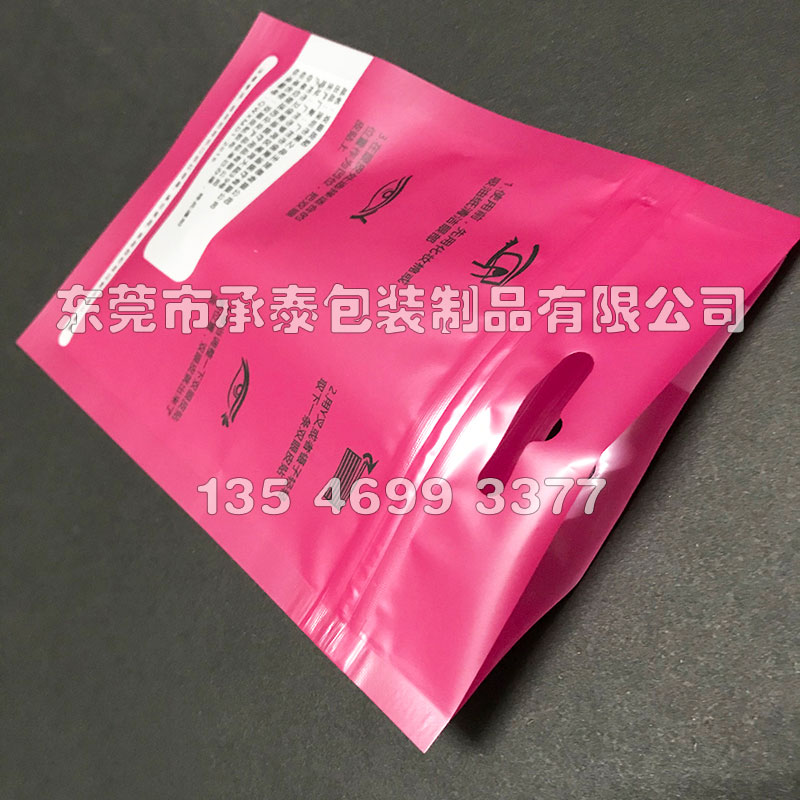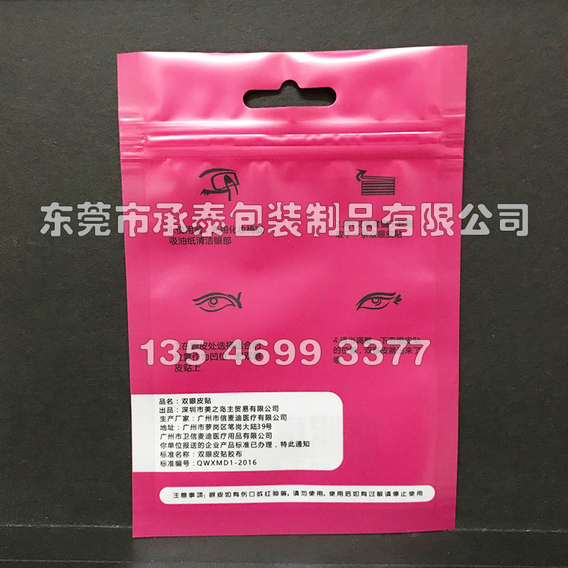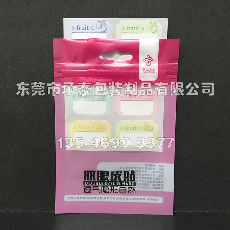 消光膜三層材質(zhì)復(fù)合,美妝用品、雙眼皮貼包裝,正面印刷開窗可以看到內(nèi)部產(chǎn)品,頂部掛孔方便貨架掛賣。