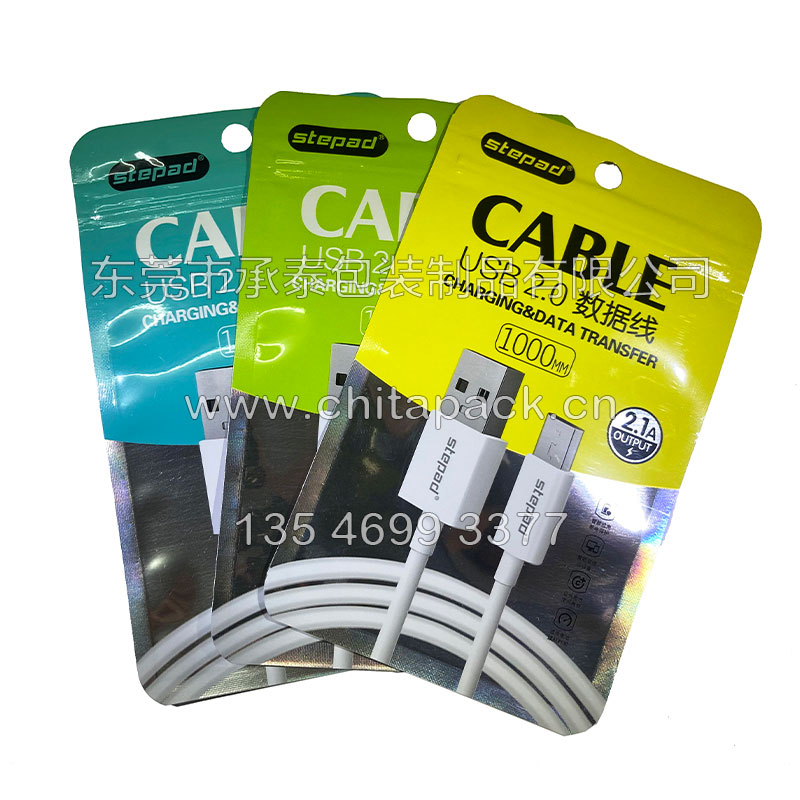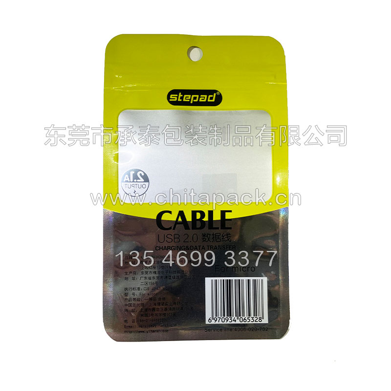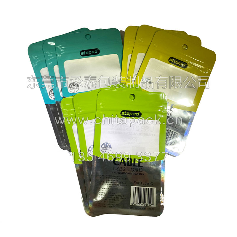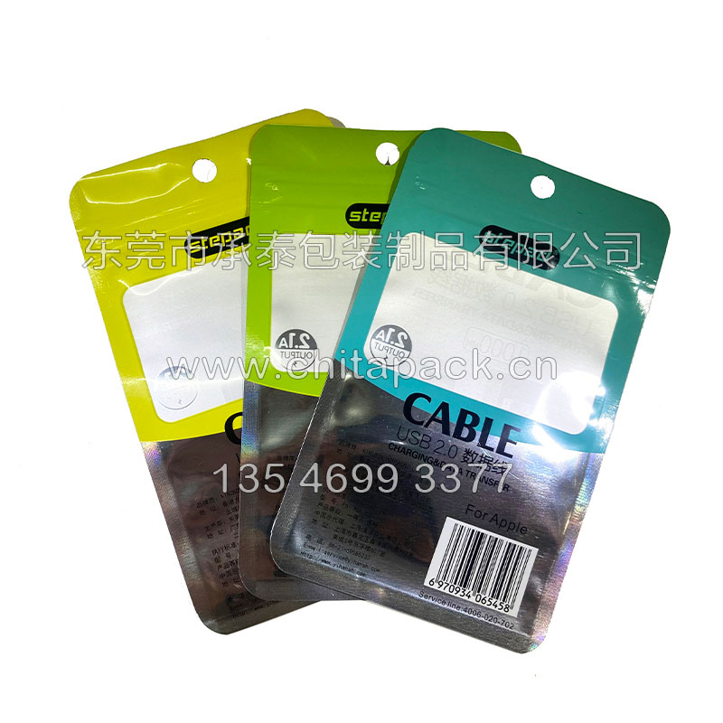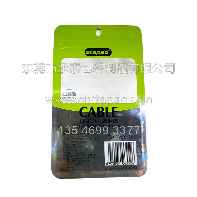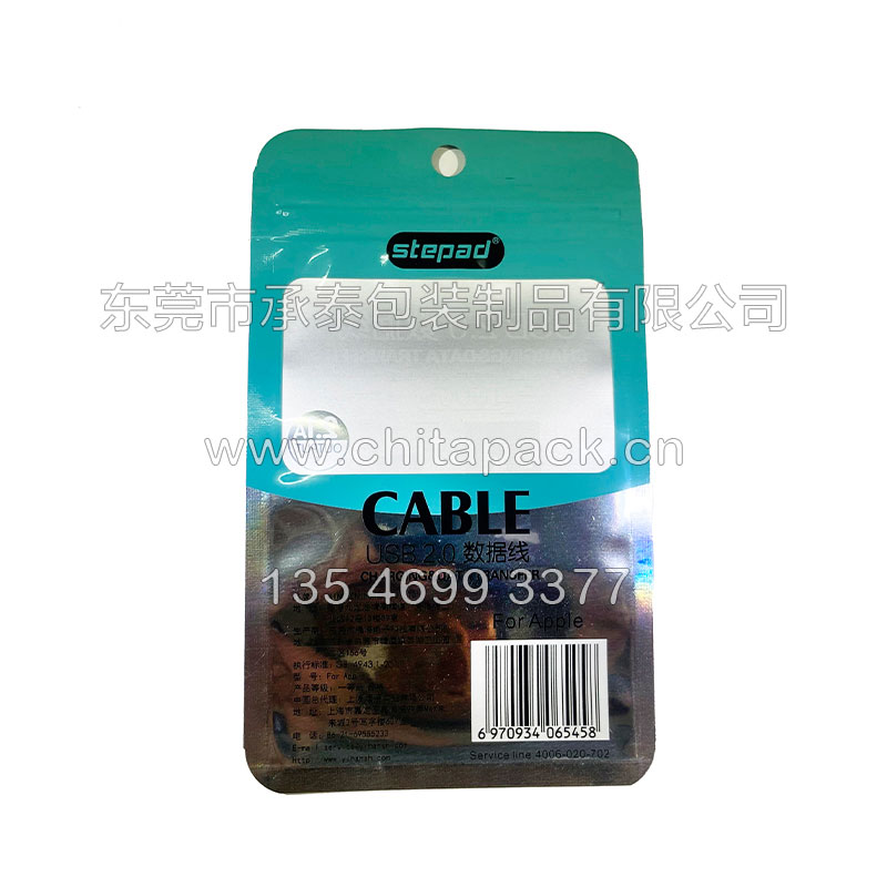 本品為同批3款數據線之一,三邊封袋型加拉鏈及掛孔,特殊洗鋁工藝,整體為鍍鋁銀色中間開透明窗,在獲得鍍鋁的印刷亮光之余,還兼得開窗功能,為產品增色不少。