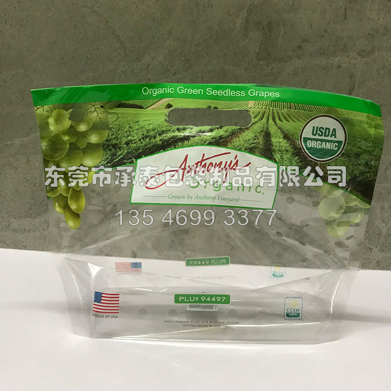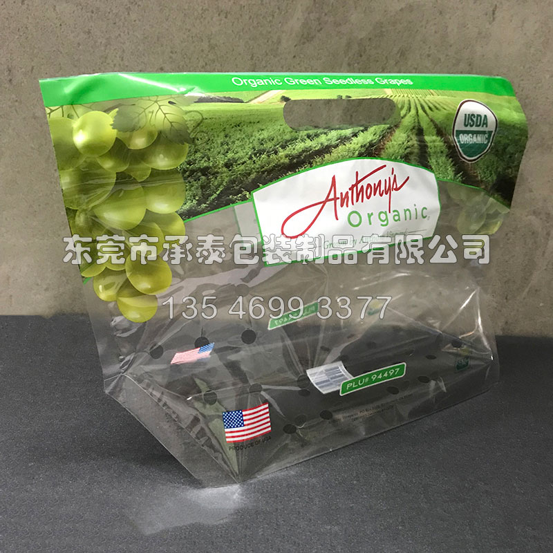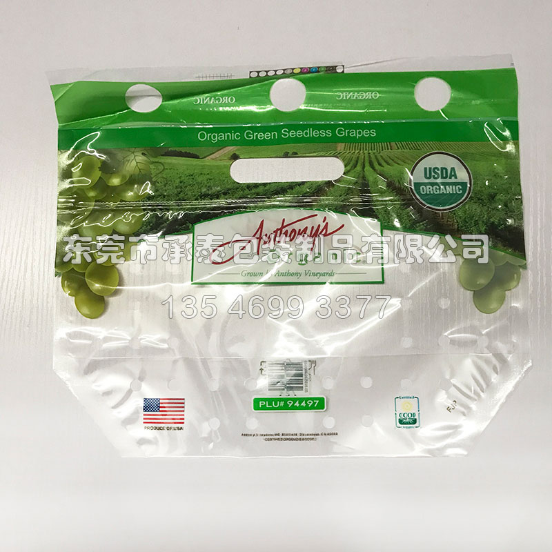 復合葡萄手提拉鏈袋,采用食品級OPP及CPP材質,成本低廉,強度好;袋身打孔透氣保鮮,防霧;可直接入冰庫冷藏,用戶更可直接水沖洗無需額外容器。