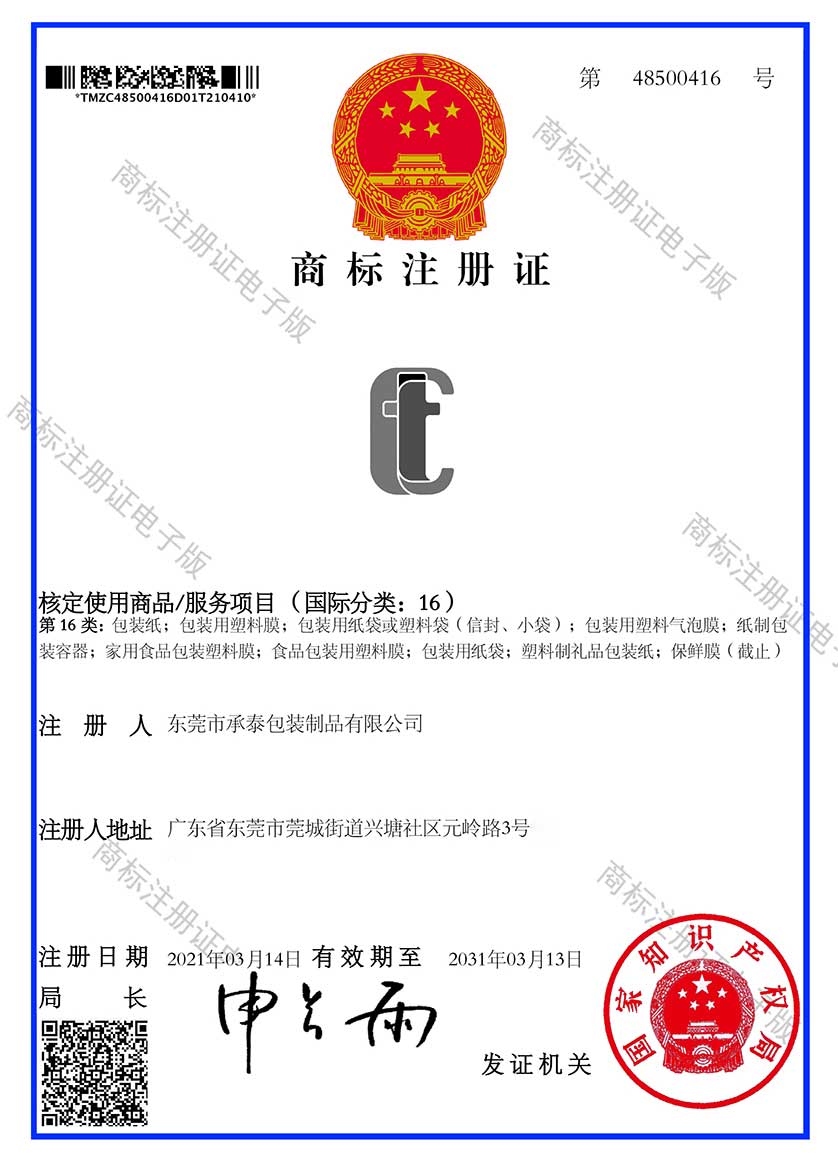 熱烈慶祝東莞市承泰包裝制品有限公司成功注冊《承泰》圖形商標!